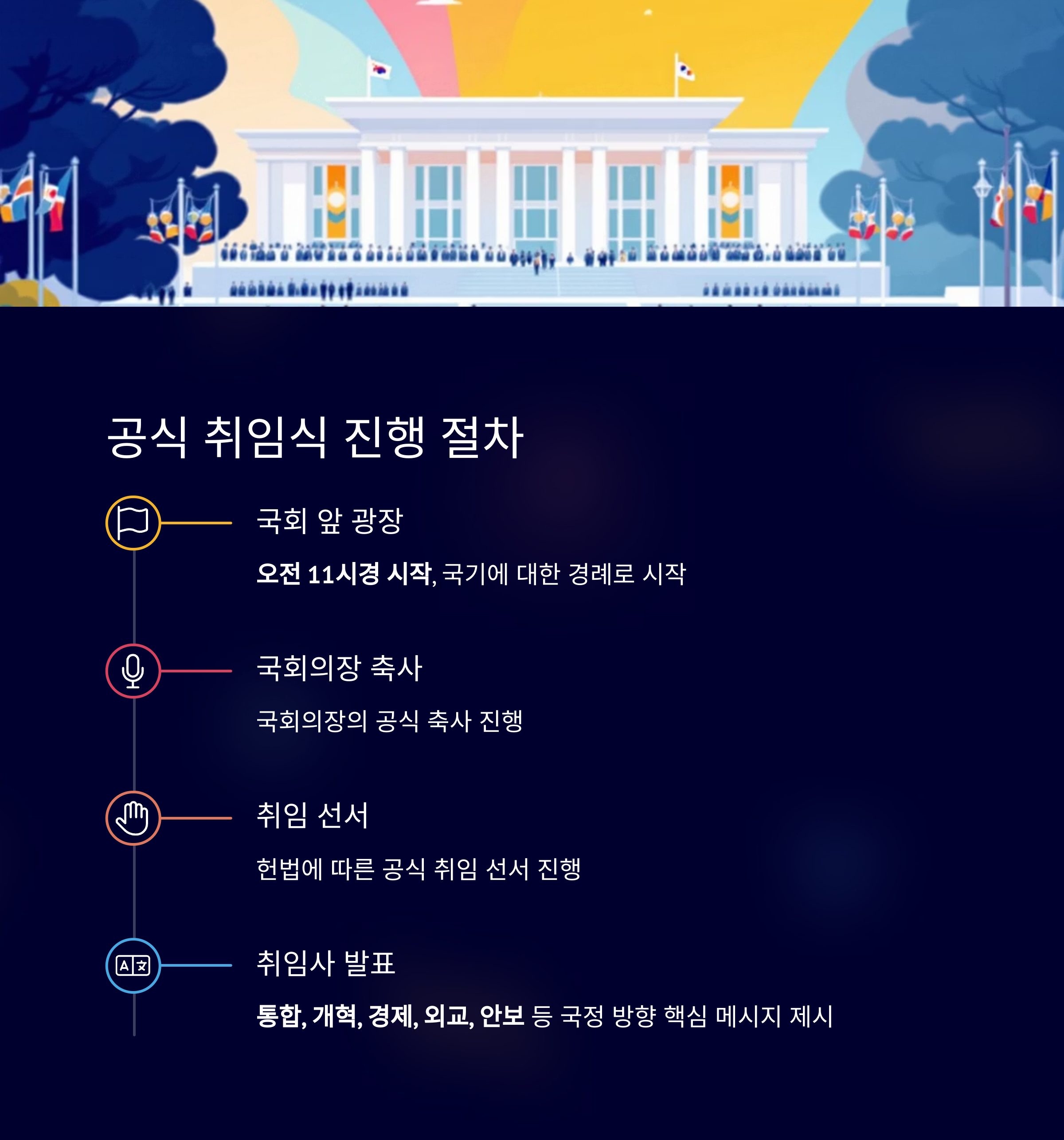 | 6월 4일 오전 11시 | 국회 앞 대통령 공식 취임식 | 취임 선서 및 취임사 발표 |