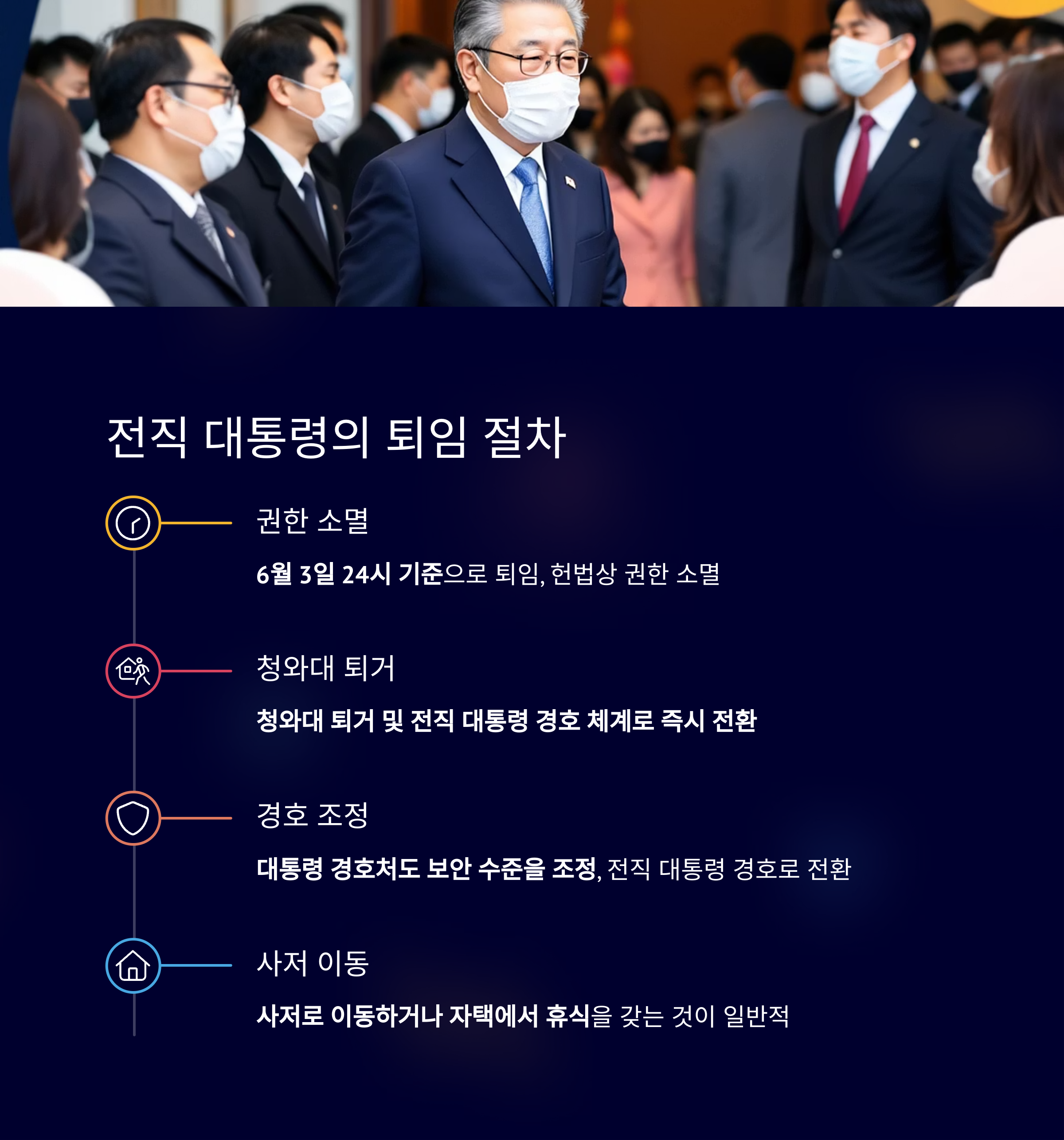 청와대 퇴거 및 전직 대통령 경호 체계로 즉시 전환되며, 대통령 경호처도 보안 수준을 조정합니다