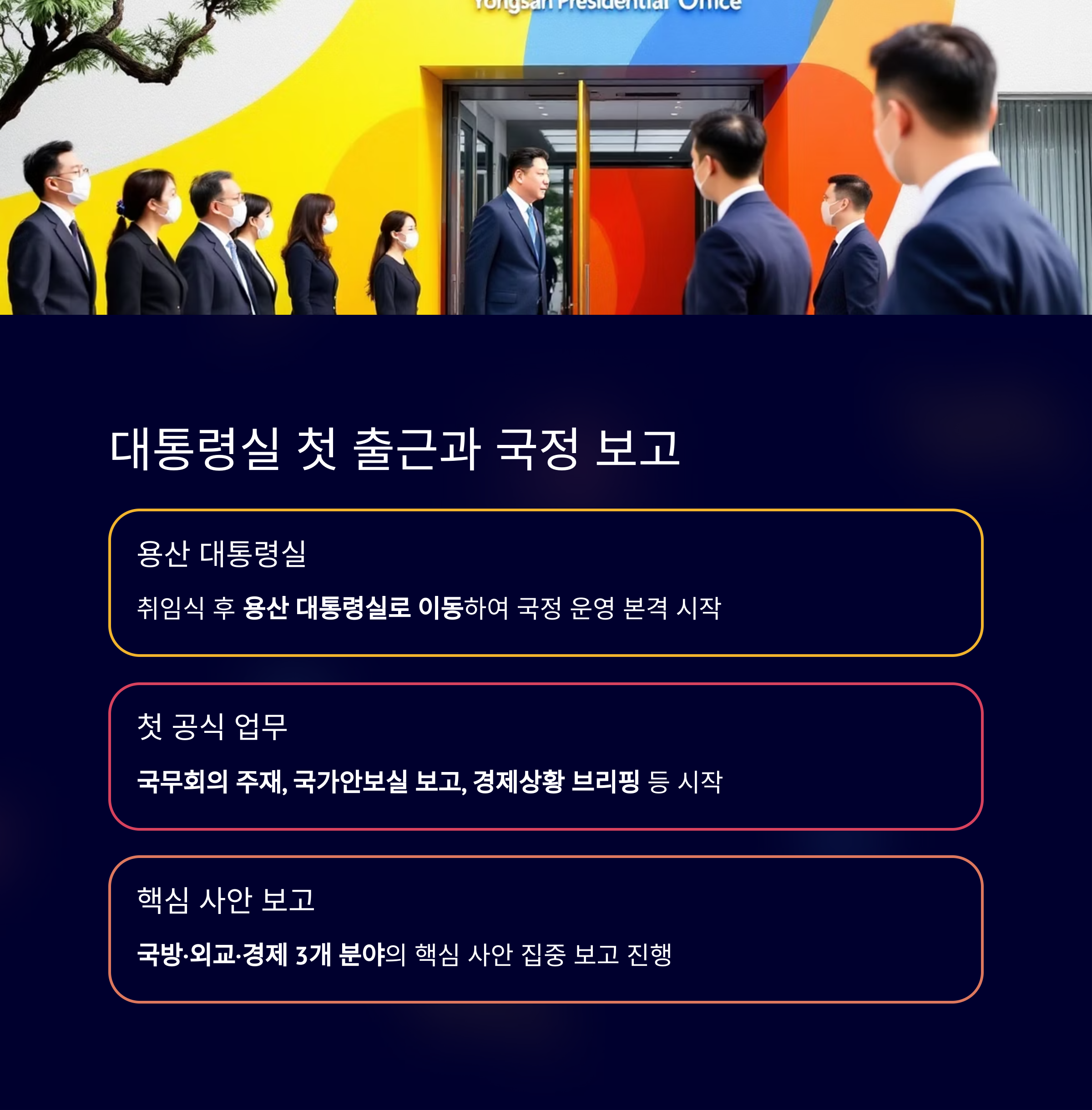 대통령 집무 시작: 대통령실 첫 출근과 국정 보고