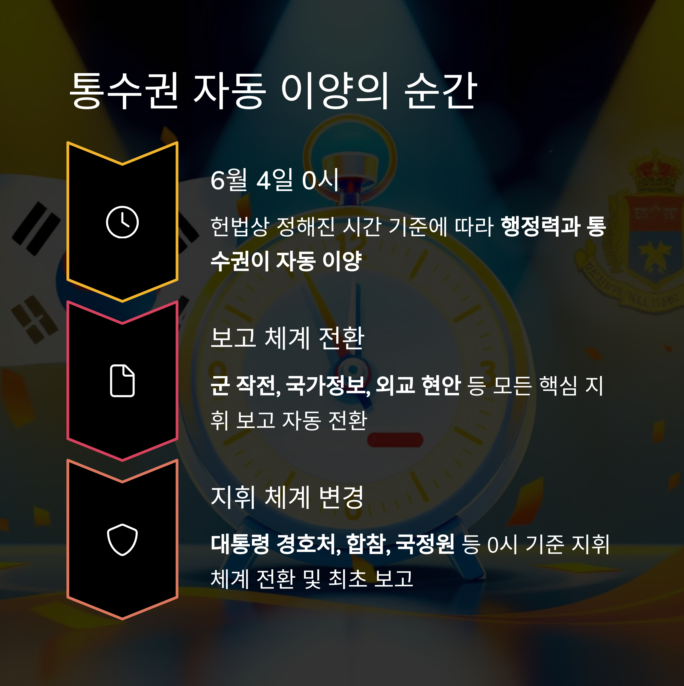 | 6월 4일 0시 | 대통령 헌법 권한 자동 발생 | 군 통수권 포함 전권 이양 |