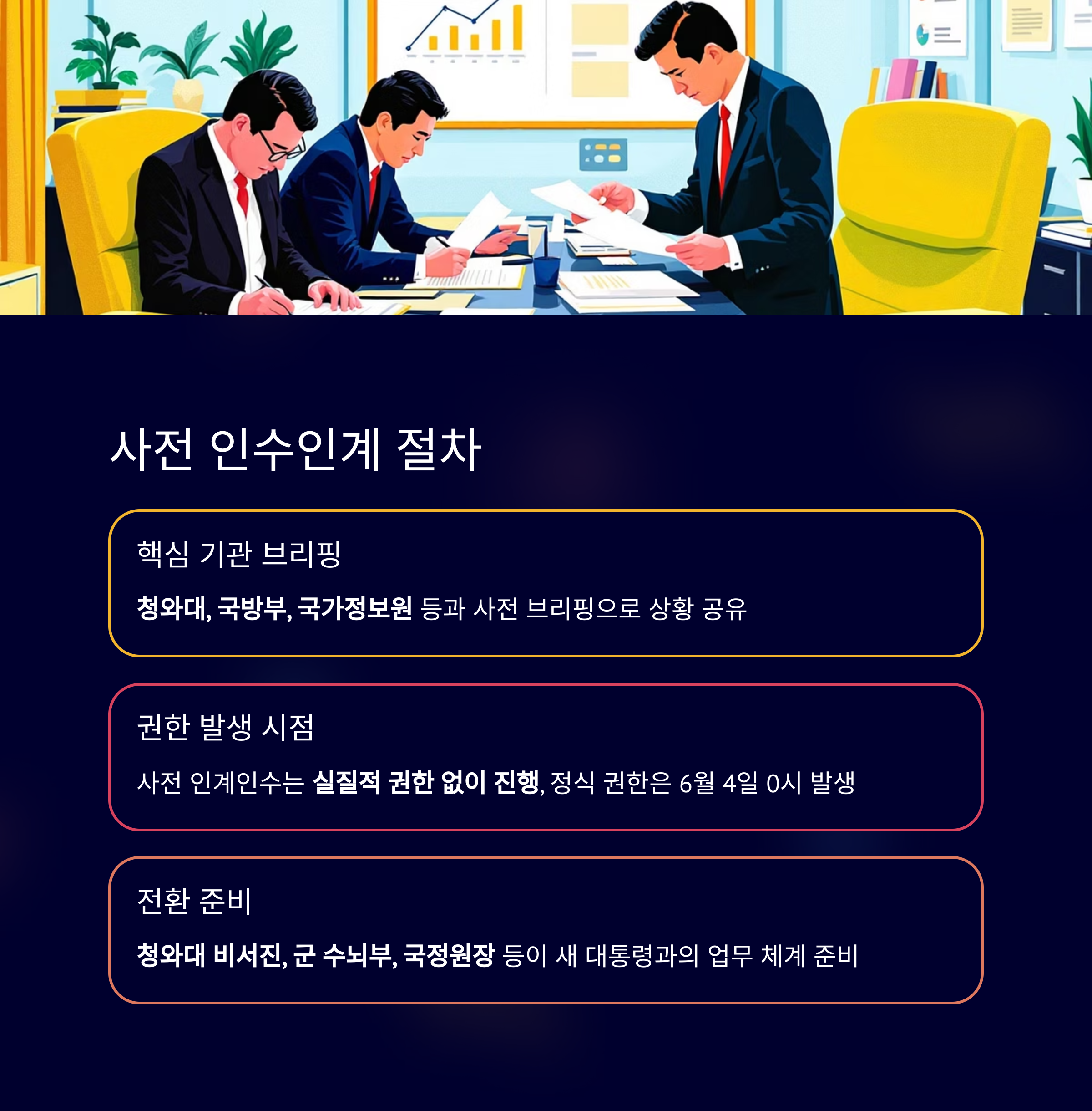 | 6월 3일 밤 | 청와대·국정기관 인수 사전 브리핑 | 정식 권한 이양 전, 협조 진행 |