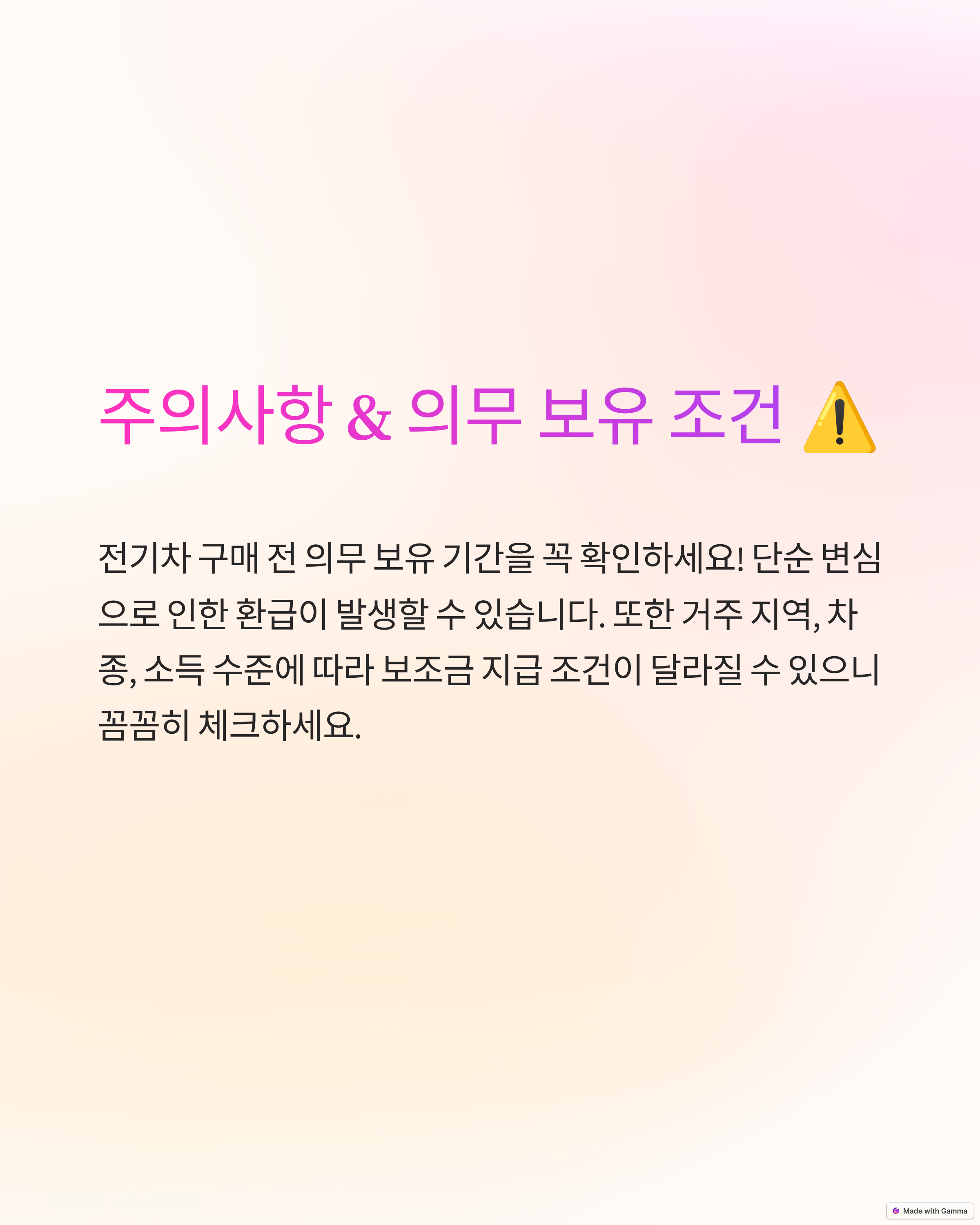 | 보조금 대상 전기차 구매 예정자, 의무 보유 조건 충족 필요 | 최대 1,200만 원까지 국비+지방비로 구성되어 지급됨 | 무공해차 누리집 확인 후 구매처 통해 신청서 제출 |