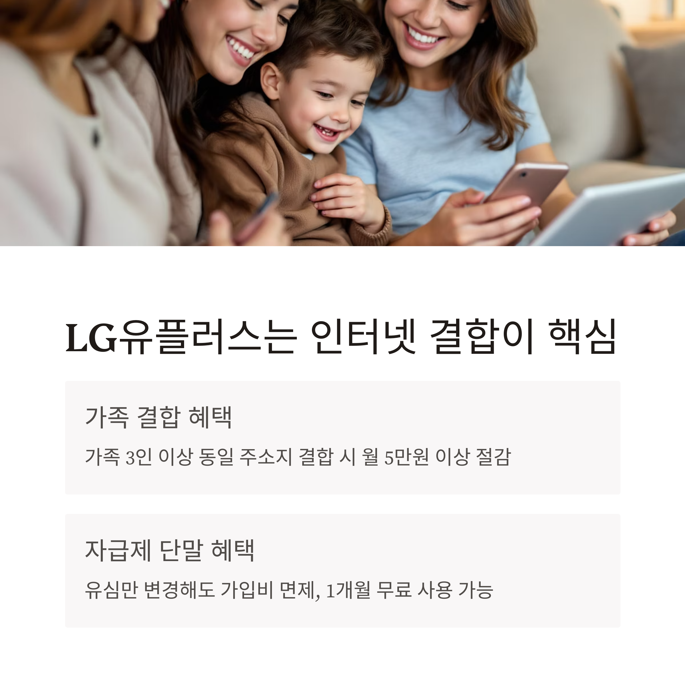 LG유플러스는 단말기 지원금보다 인터넷+모바일 결합 할인으로 큰 혜택을 주는 구조입니다.