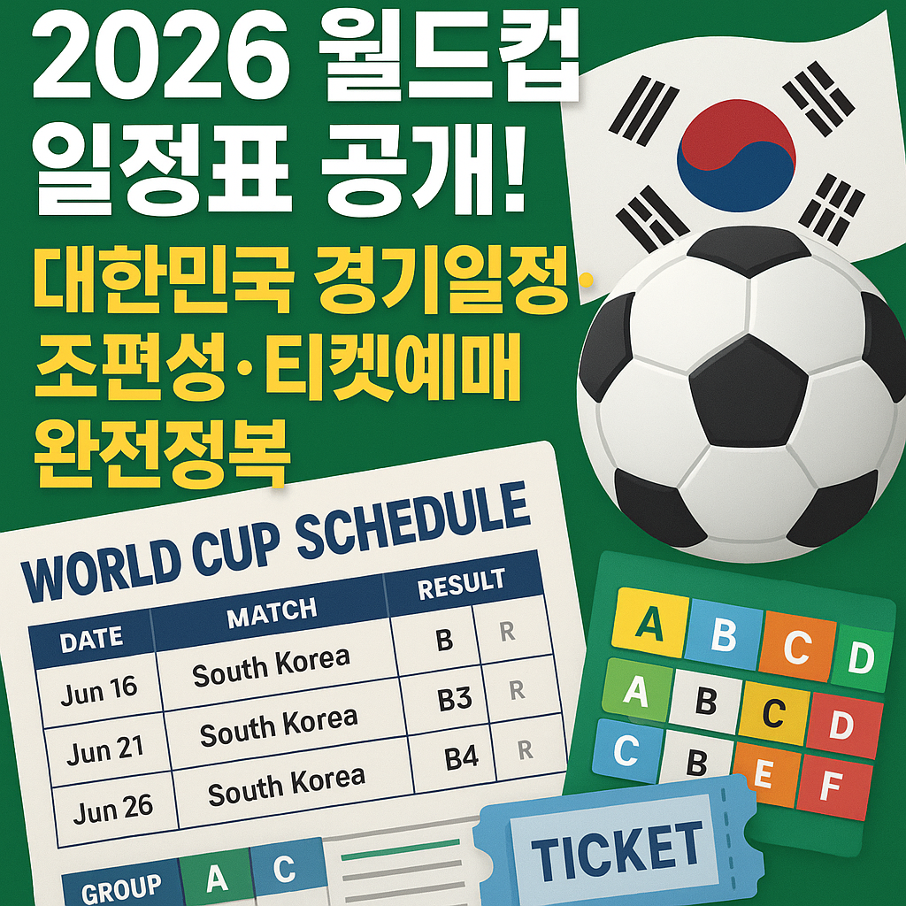 2026년 북중미 월드컵이 다가오며 공식 일정이 발표되었습니다. 대한민국 축구 팬들의 관심이 집중되는 시점! 이번 글에서는 대한민국의 경기일정, 예선 통과 현황, 조편성 방식, 중계 채널, 그리고 티켓 예매 시기까지 월드컵 관련 필수 정보를 깔끔하게 정리해드릴게요. 모바일로도 보기 편한 경기 일정표도 함께 제공하니 꼭 끝까지 읽어보세요!