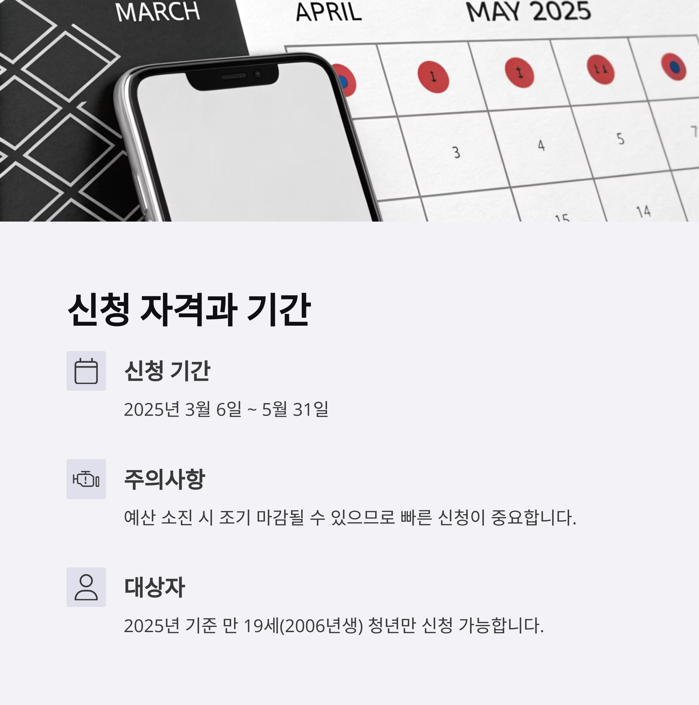 - 대상: 2025년 기준 만 19세(2006년생) 청년