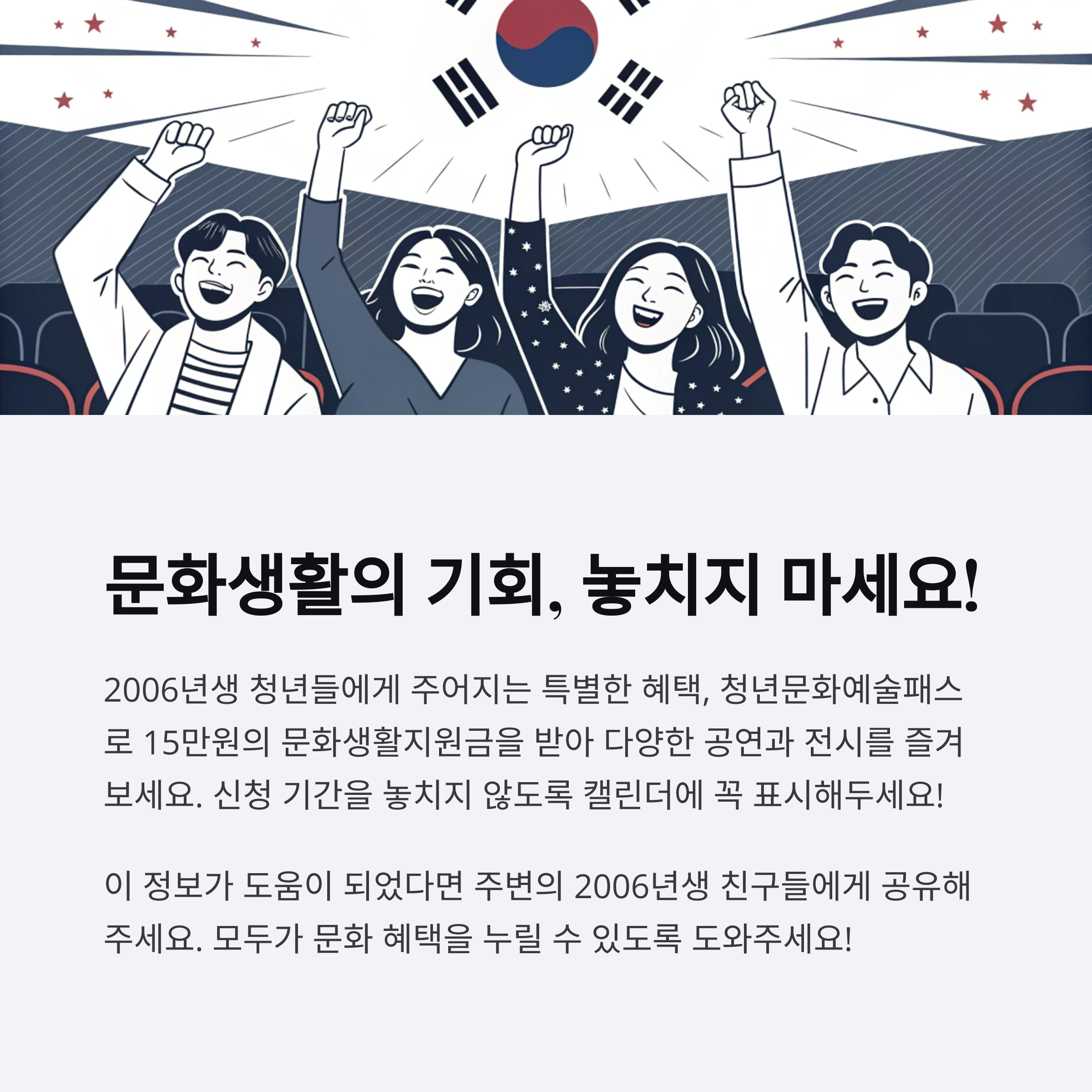 - 선착순: 예산 소진 시 조기 마감될 수 있으므로 빠른 신청이 중요합니다. (06년생 모르면 손해인 필수 혜택! 청년문화예술패스로 뮤지컬 공짜로 ..., "19세 청년이라면 15만원 지원!" 2025 청년문화예술패스 완전 정복)