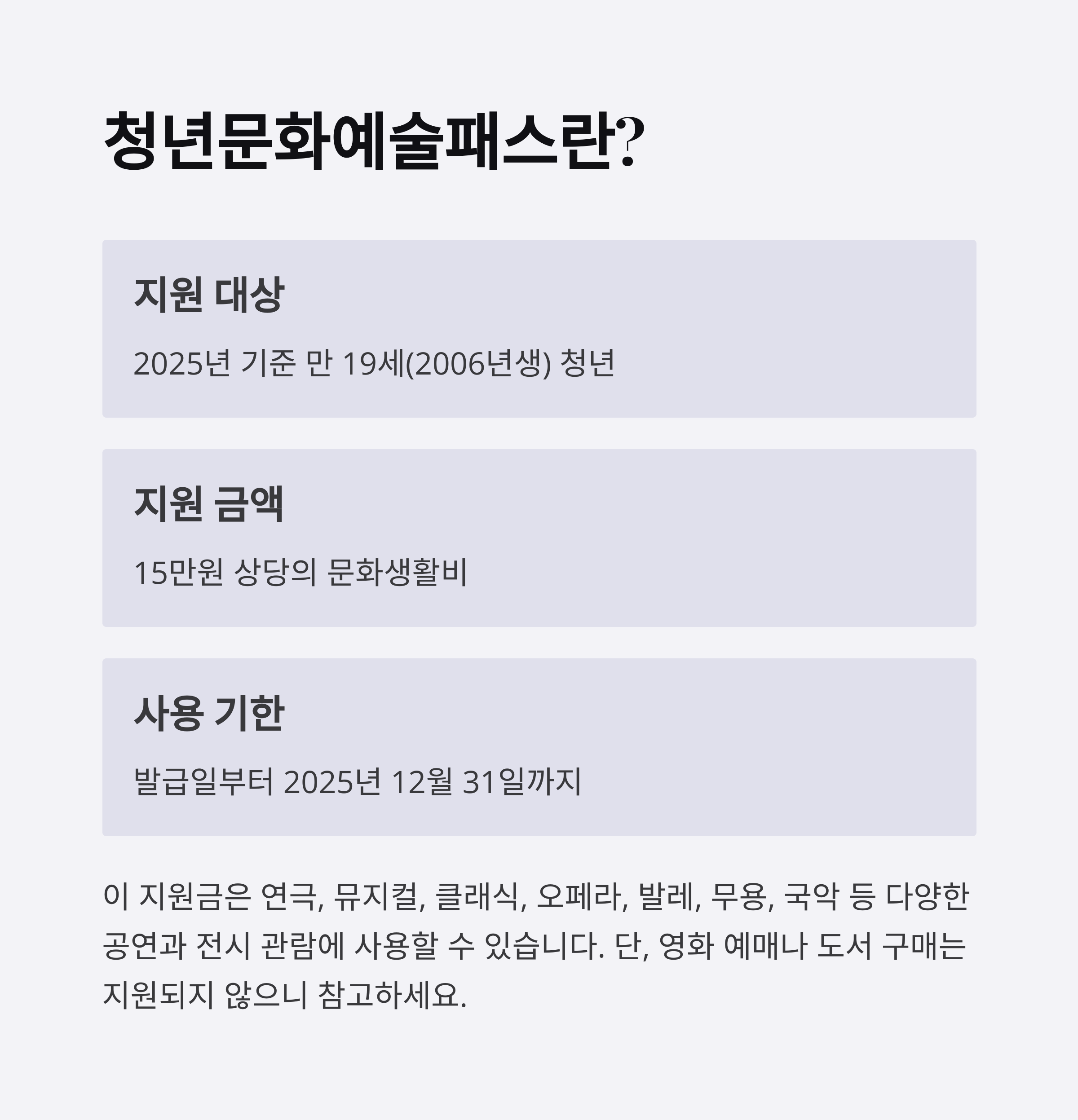 2025년부터 시행되는 청년문화예술패스는 만 19세 청년들에게 15만 원 상당의 문화생활비를 지원하는 제도입니다. 이 지원금은 연극, 뮤지컬, 클래식, 오페라, 발레, 무용, 국악 등 다양한 공연과 전시 관람에 사용할 수 있습니다. 영화 예매나 도서 구매는 지원되지 않으니 참고하세요. (청년문화예술패스 2025 : 만 19세 청년을 위한 문화생활 지원금 신청 ...)
