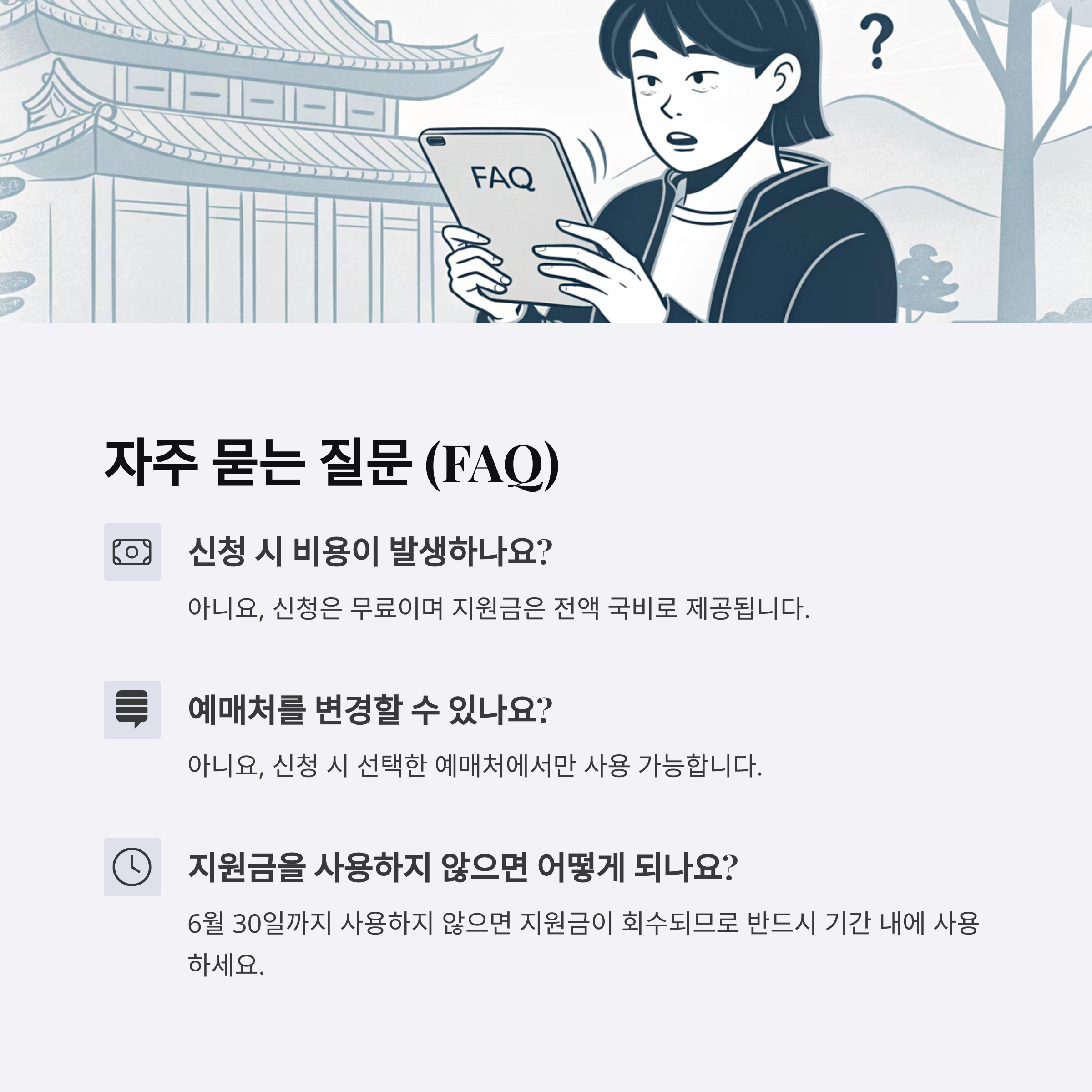 A3. 6월 30일까지 사용하지 않으면 지원금이 회수되므로 반드시 기간 내에 사용하세요. ("19세 청년이라면 15만원 지원!" 2025 청년문화예술패스 완전 정복)