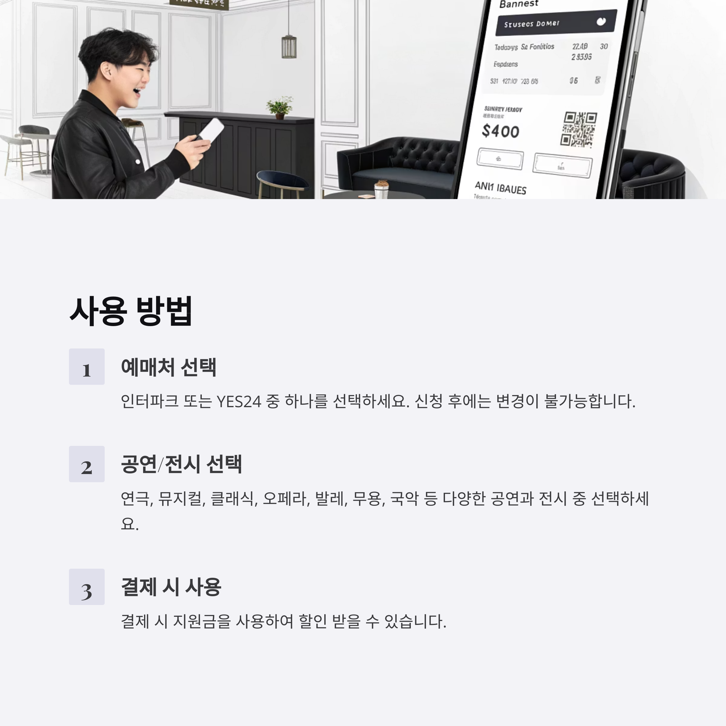 - 사용처: 인터파크 또는 YES24에서 공연 및 전시 예매 시 사용