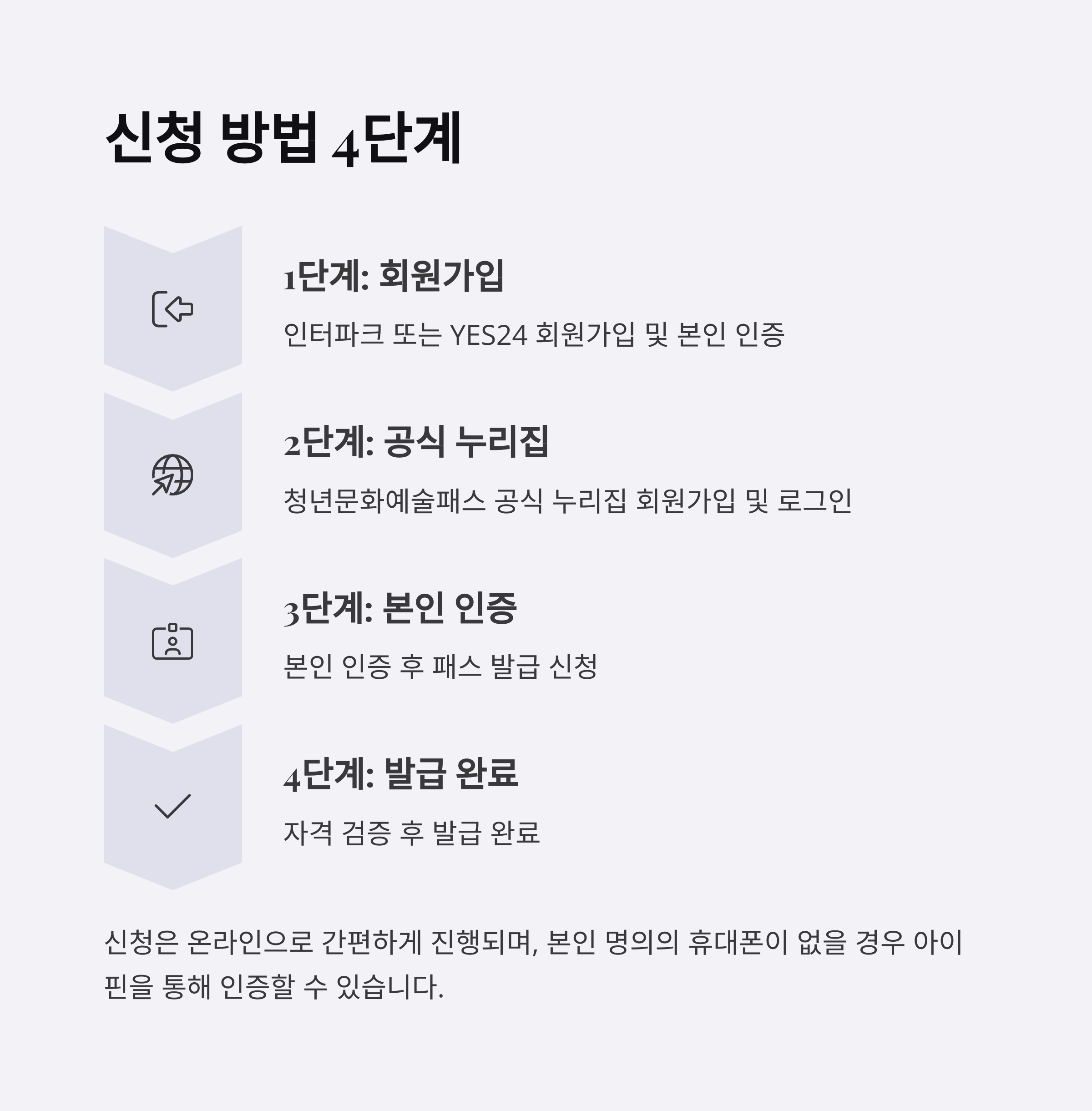 신청은 온라인으로 간편하게 진행되며, 본인 명의의 휴대폰이 없을 경우 아이핀을 통해 인증할 수 있습니다. (2025 청년문화예술패스 신청 방법과 혜택 안내)