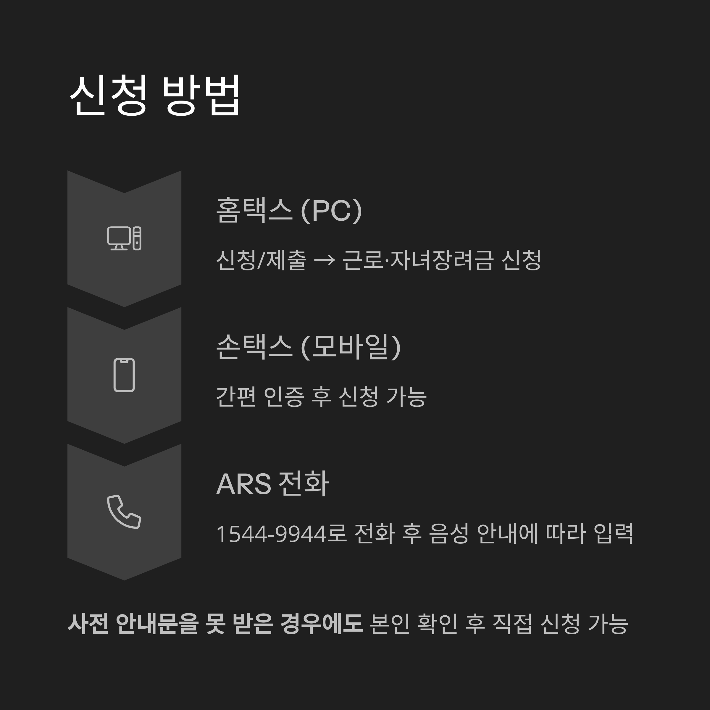 국세청에서 사전 안내문을 받은 경우, 안내에 따라 홈택스 또는 손택스에서 간편하게 신청 가능합니다.