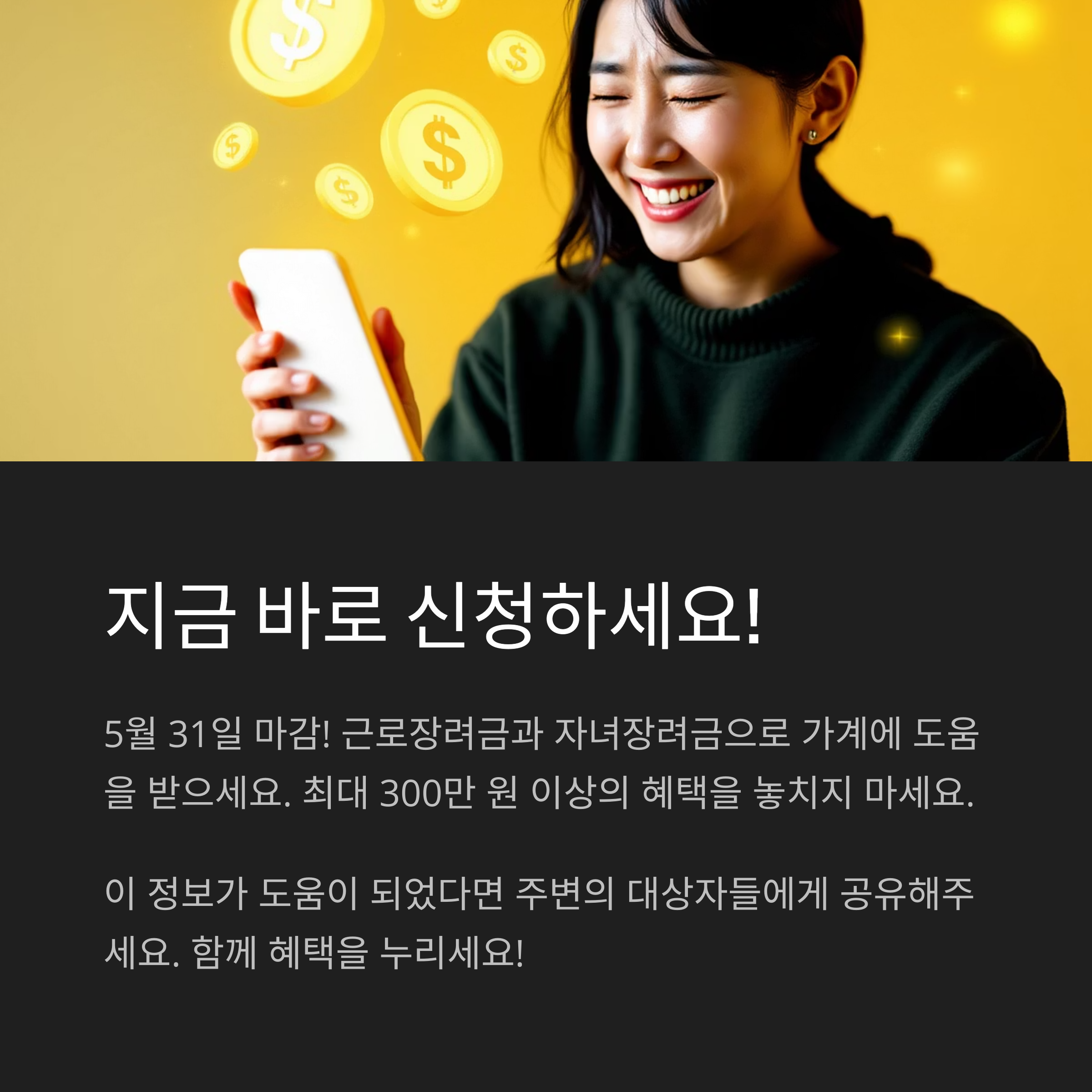 근로장려금은 열심히 일하지만 소득이 낮은 가구에게 지급되는 지원금입니다.