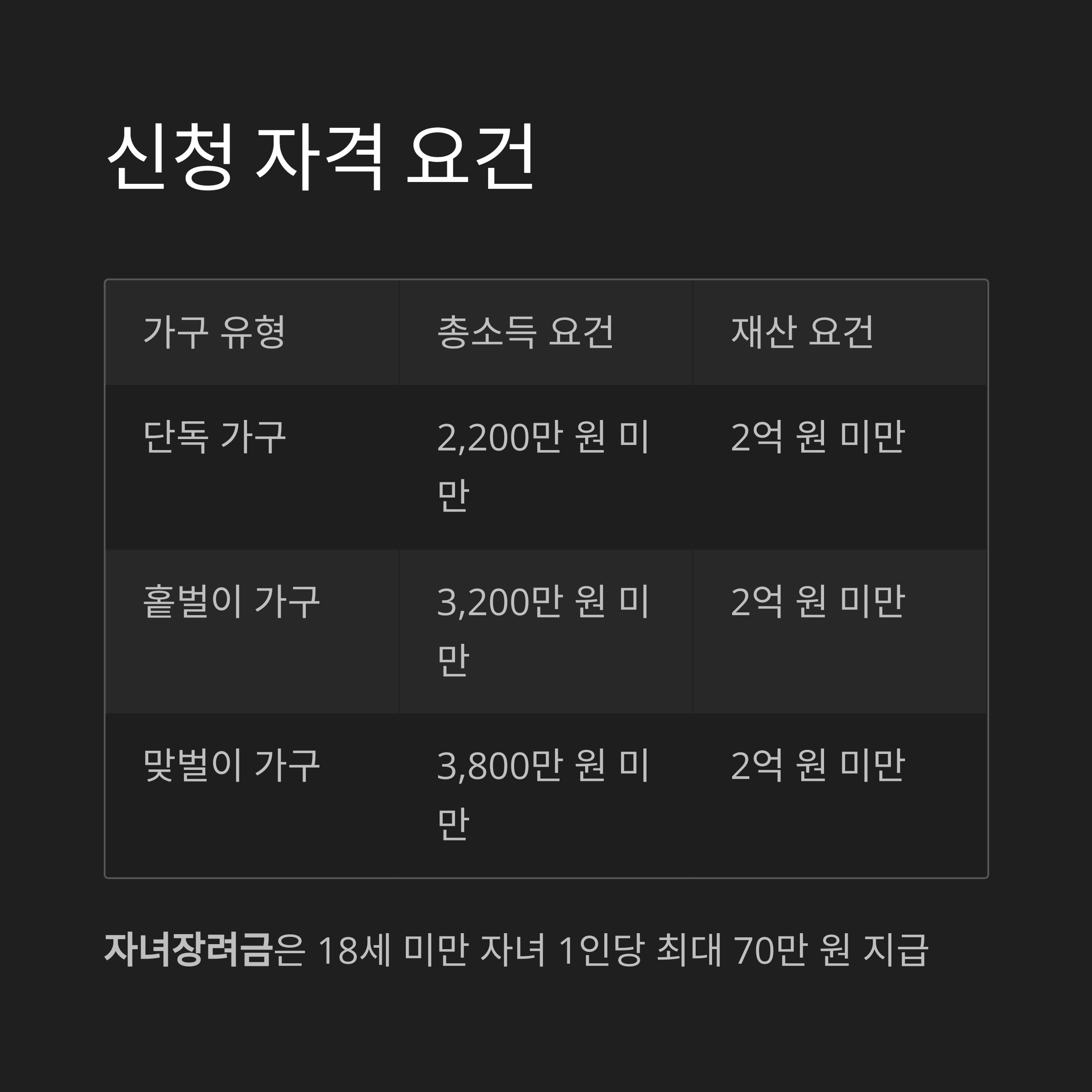 | 홑벌이 가구 | 260만 원 | 자녀 수 × 70만 원 |