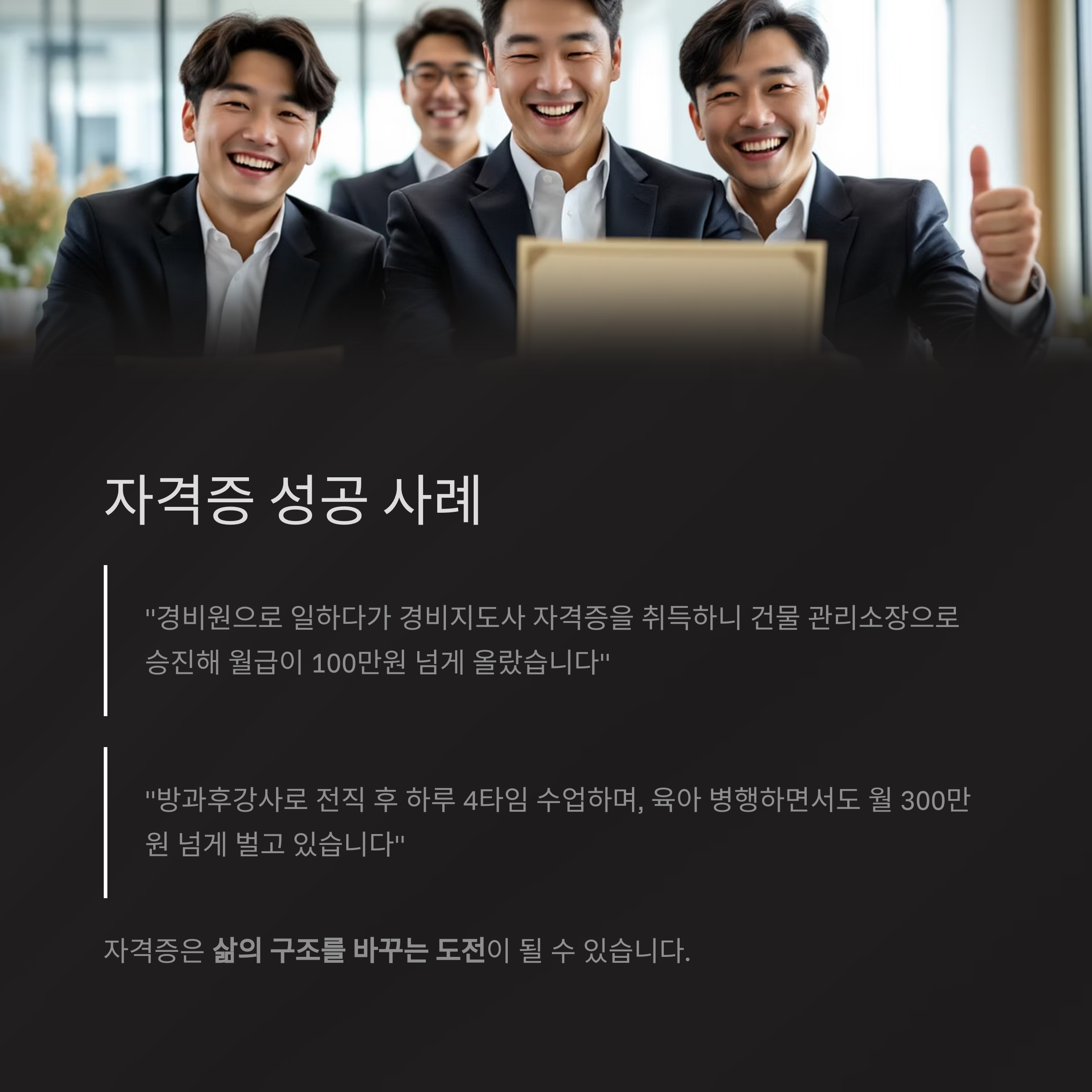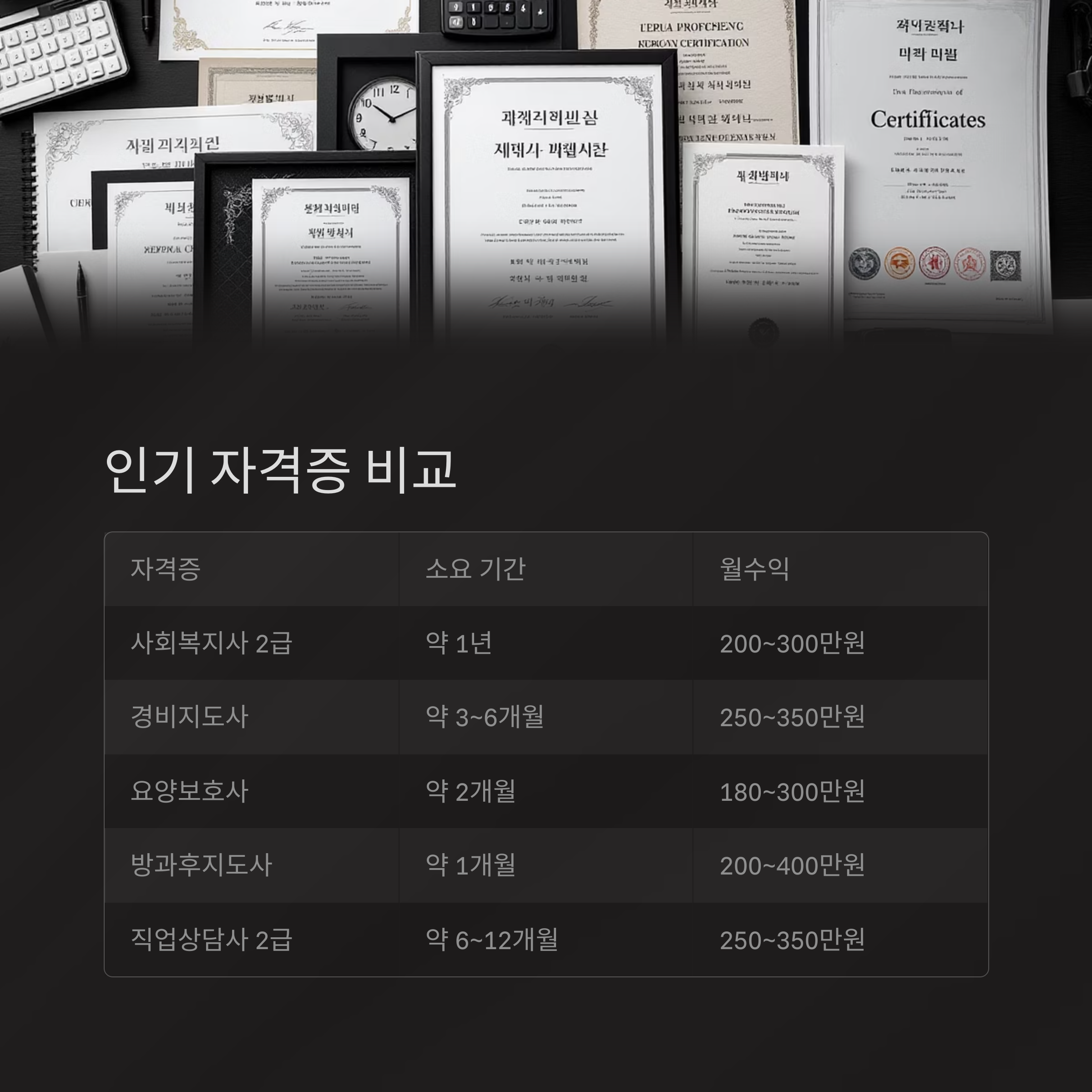 | 경비지도사 | 약 3~6개월 | 250~350만원 | 관리직 진입 가능 |