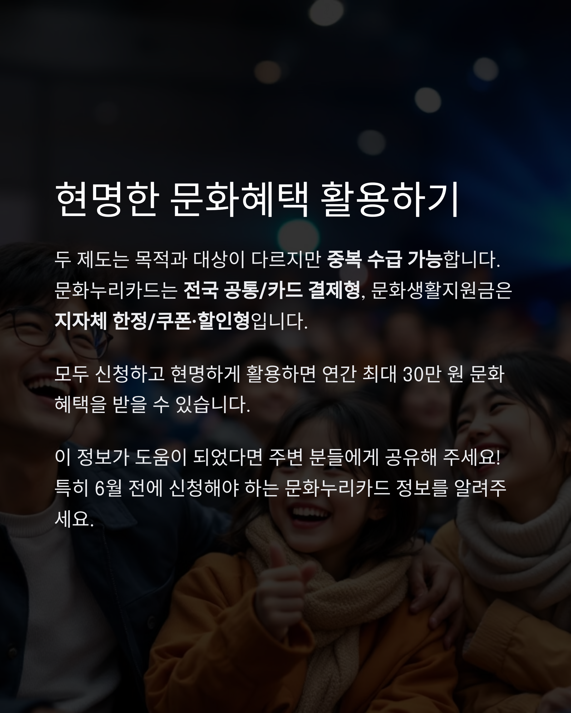 | 신청 기한 | 문화누리카드: 11월 말 / 지원금: 지자체 공고일 기준 |
