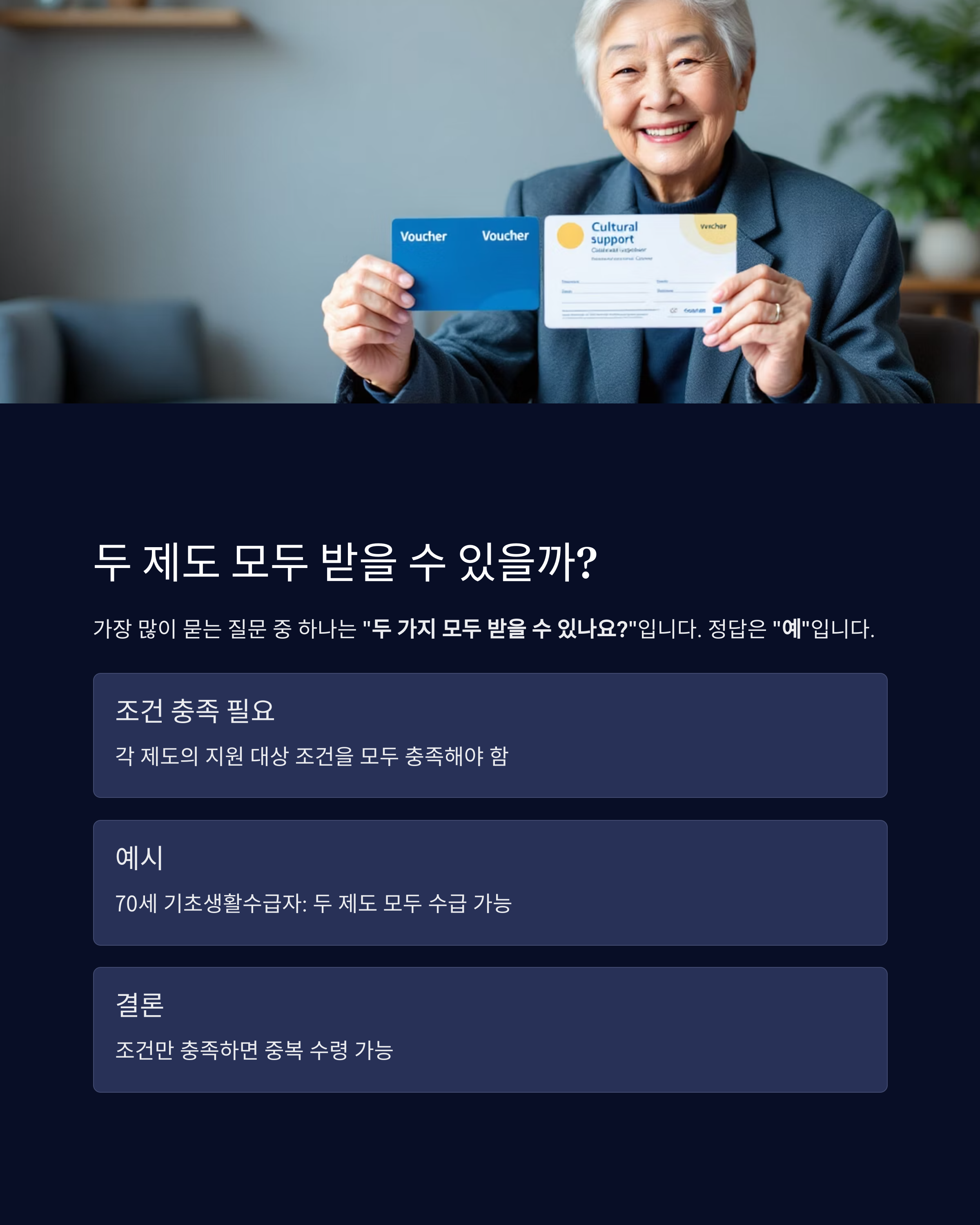 정답은 **“예”**입니다. 단, 중복 수급이 가능하더라도 지원 대상 조건이 다르기 때문에 모두 충족해야 합니다.