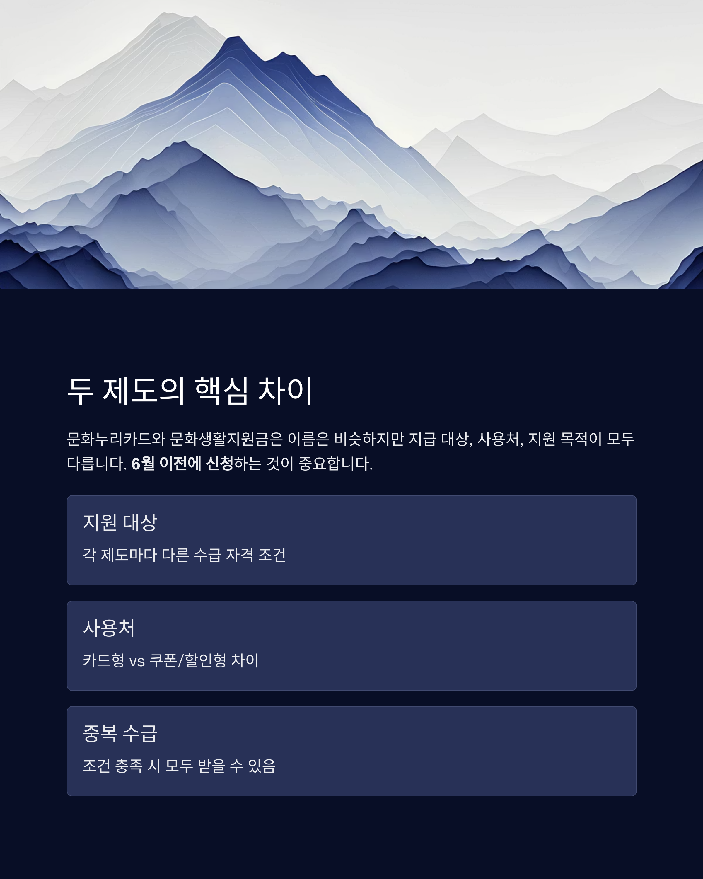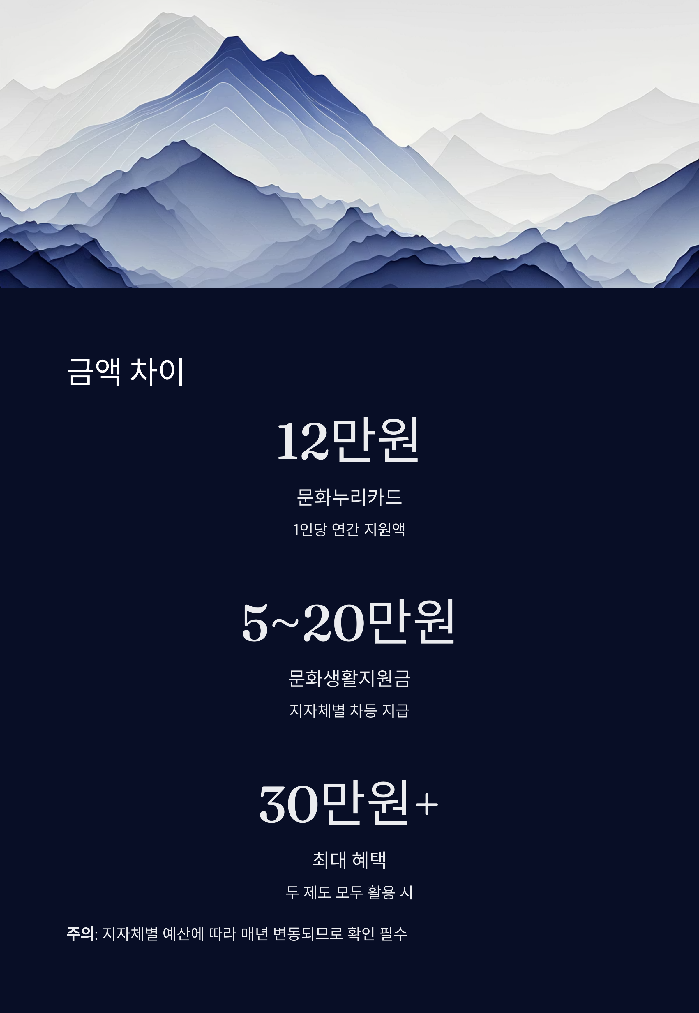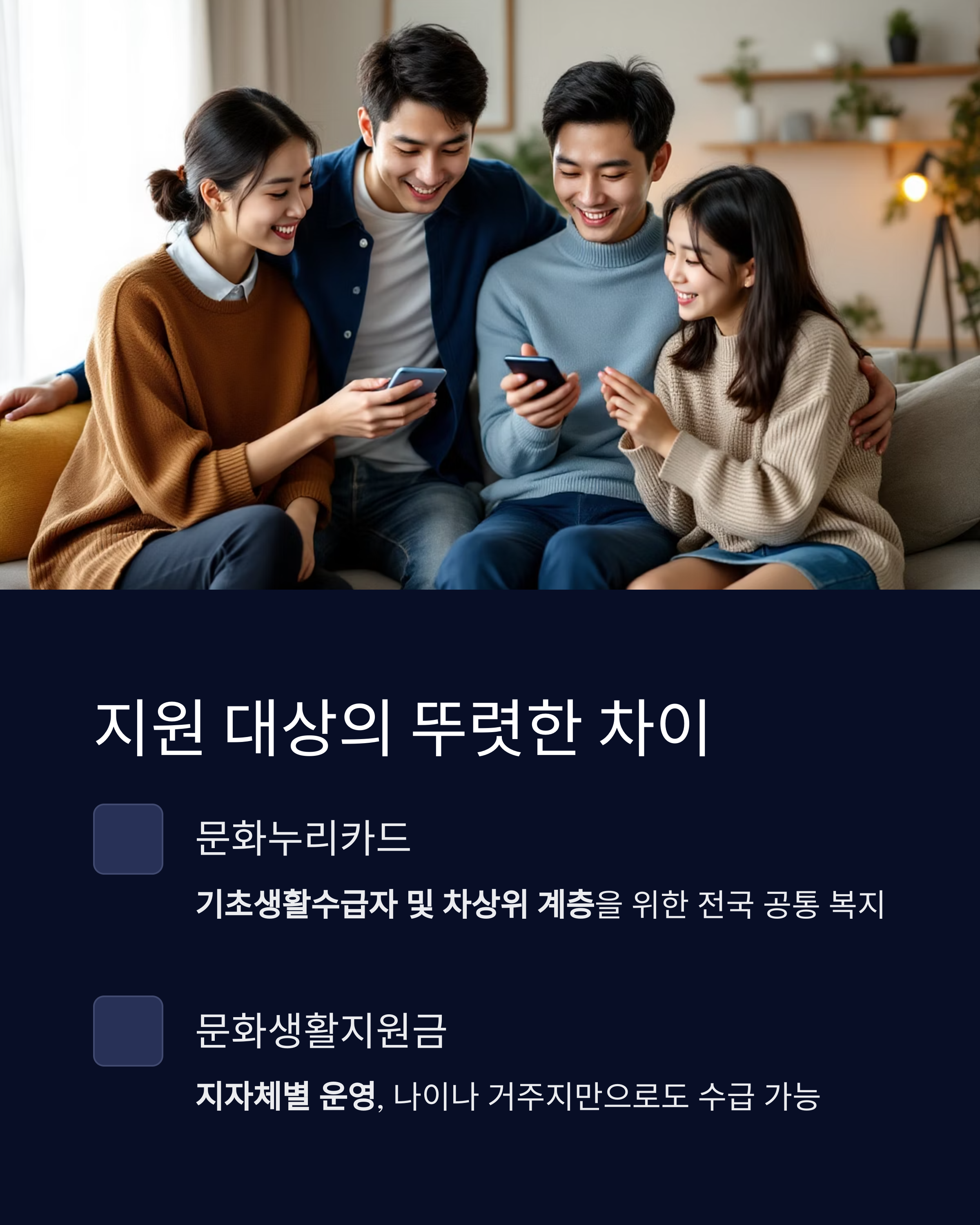 핵심: 문화누리카드는 전국 공통 복지, 문화생활지원금은 지역별 상이한 조건