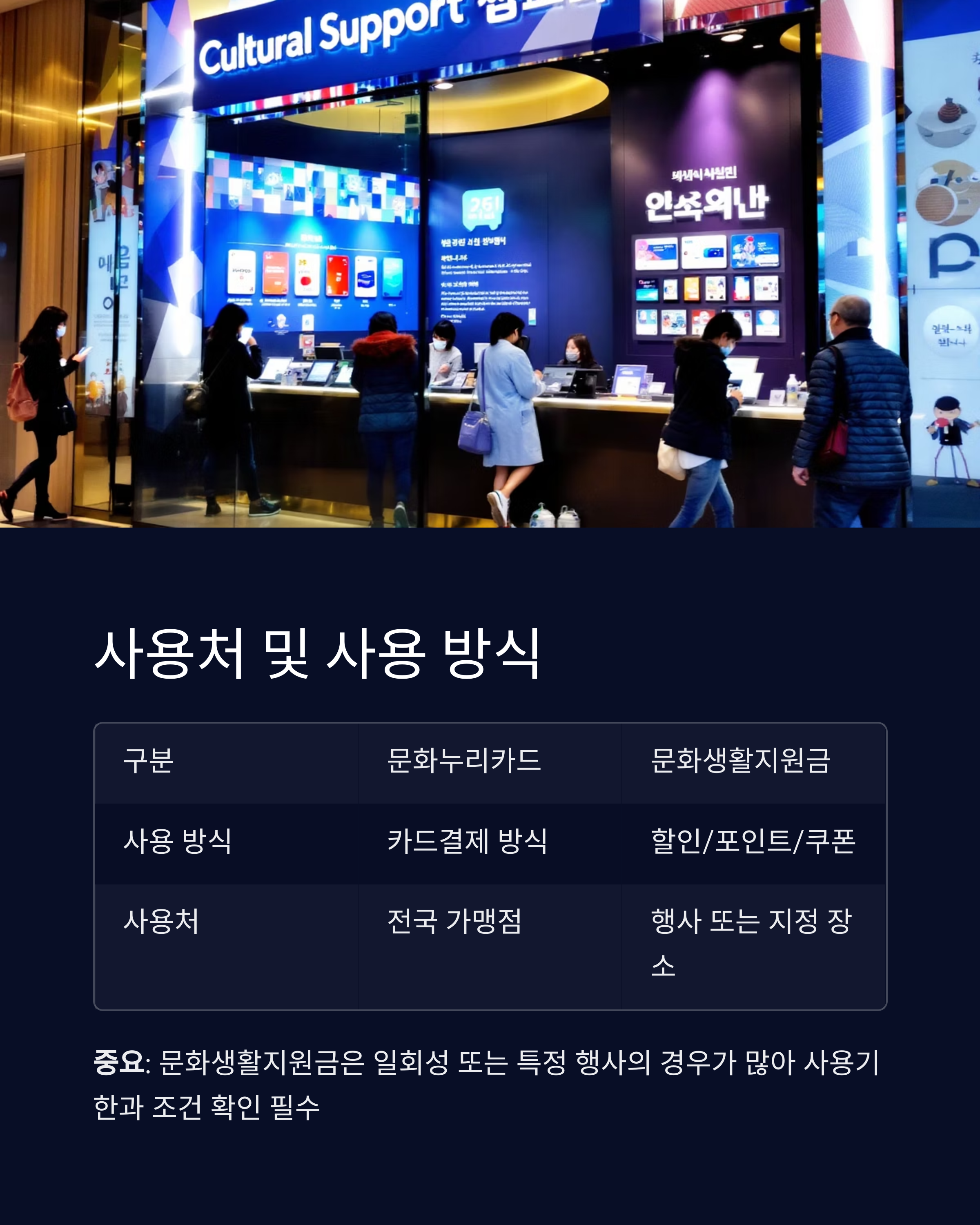 문화누리카드와 문화생활지원금은 이름은 비슷하지만 지급 대상, 사용처, 지원 목적이 모두 다릅니다.