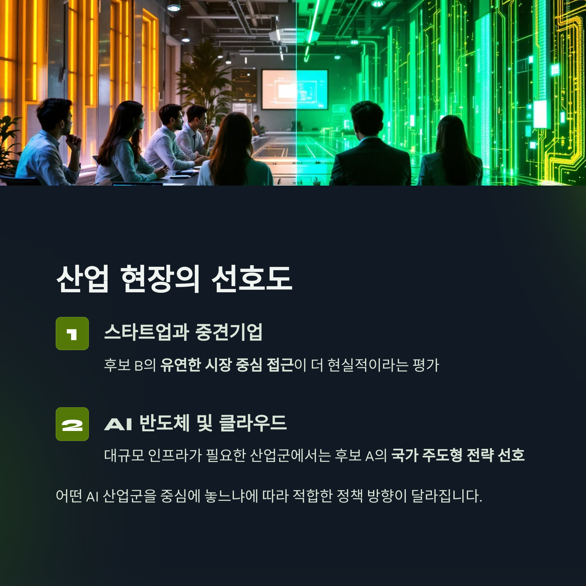 두 후보 모두 AI 산업을 국가 미래 성장 동력으로 보고 있으나,
