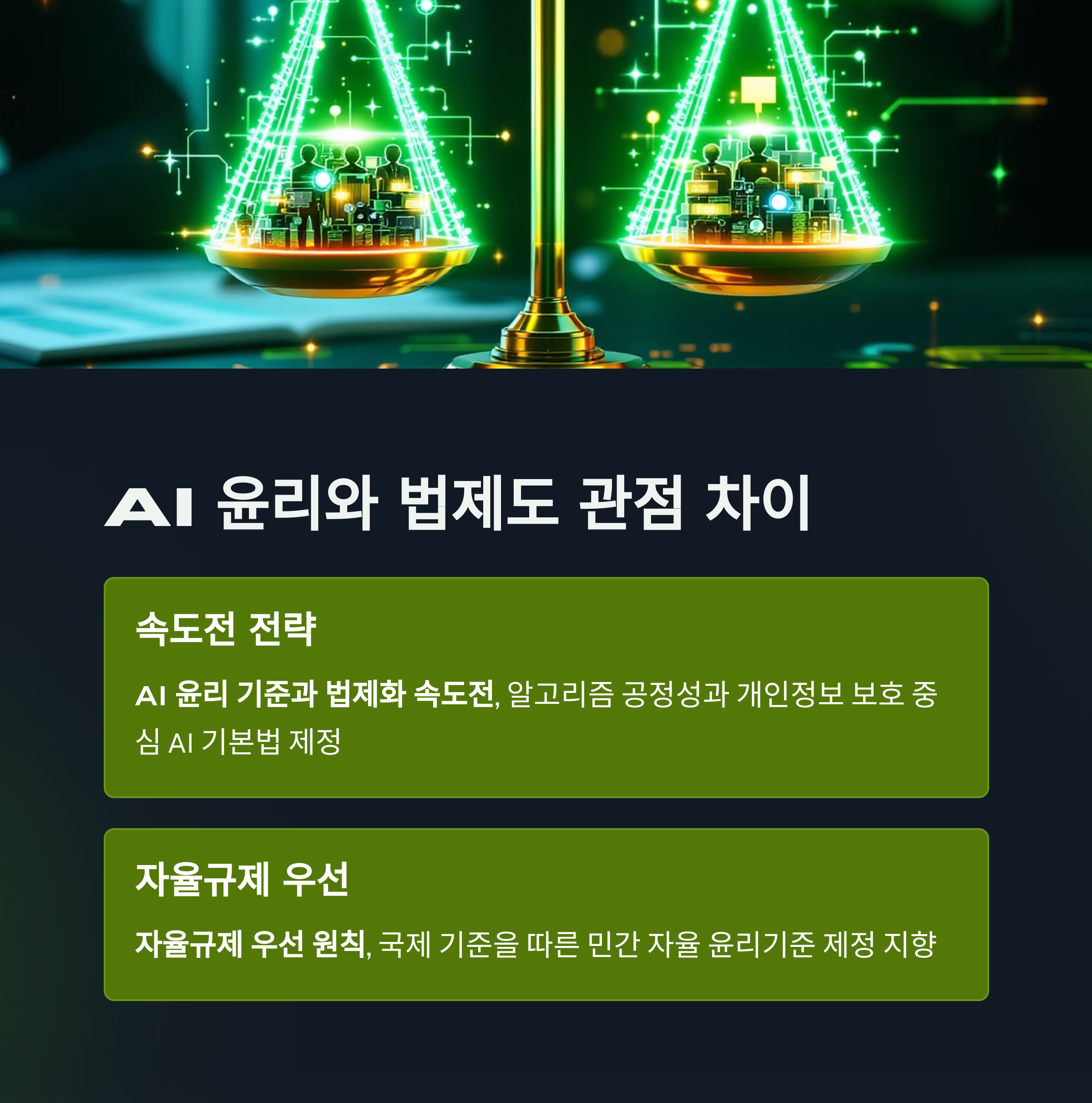 | 법제도 방향 | AI 관련 법 제정 및 규제 | 규제 완화 중심 |