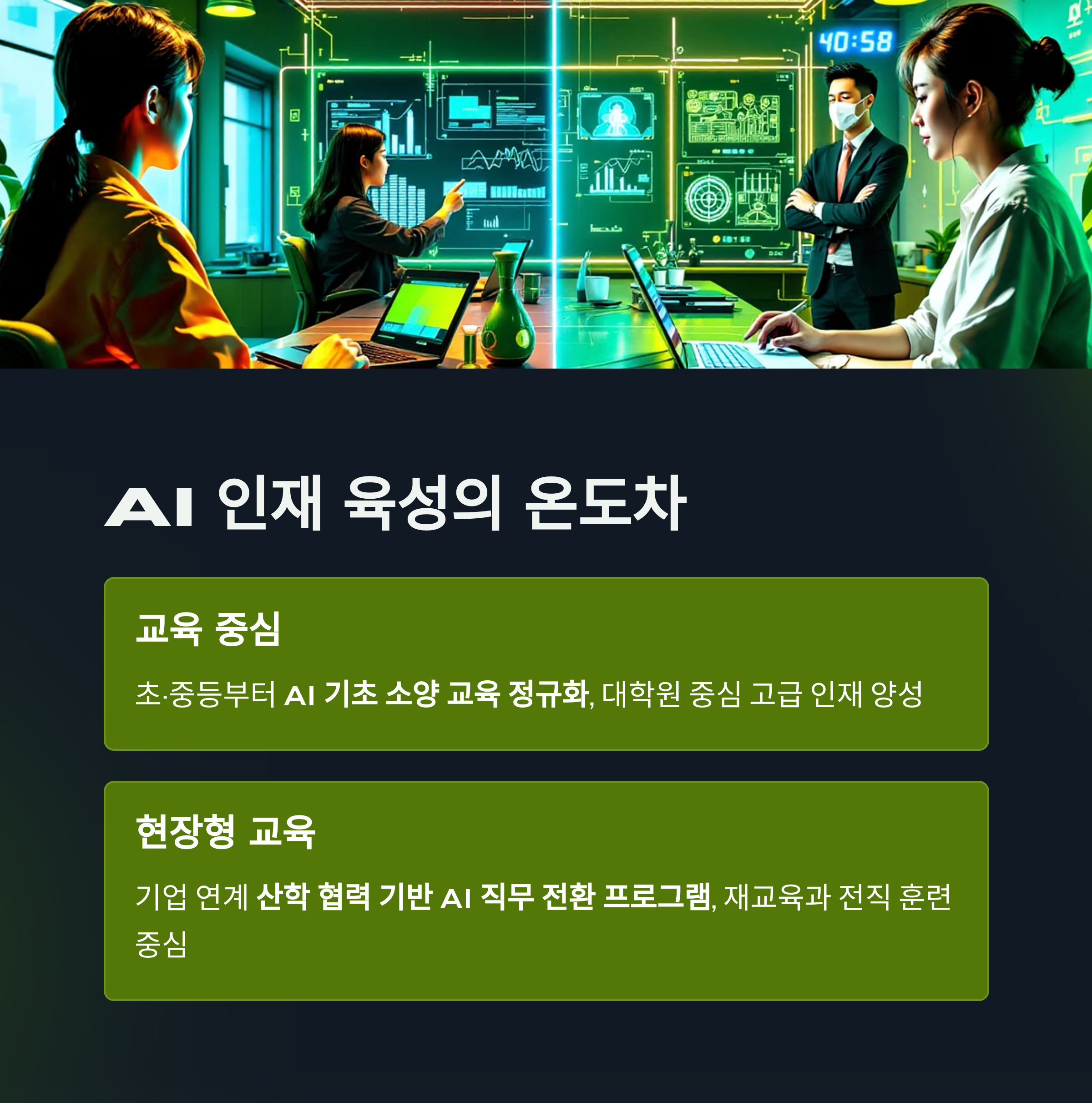 | AI 인재 정책 | 공교육 개편 중심 | 기업 중심 재교육 |