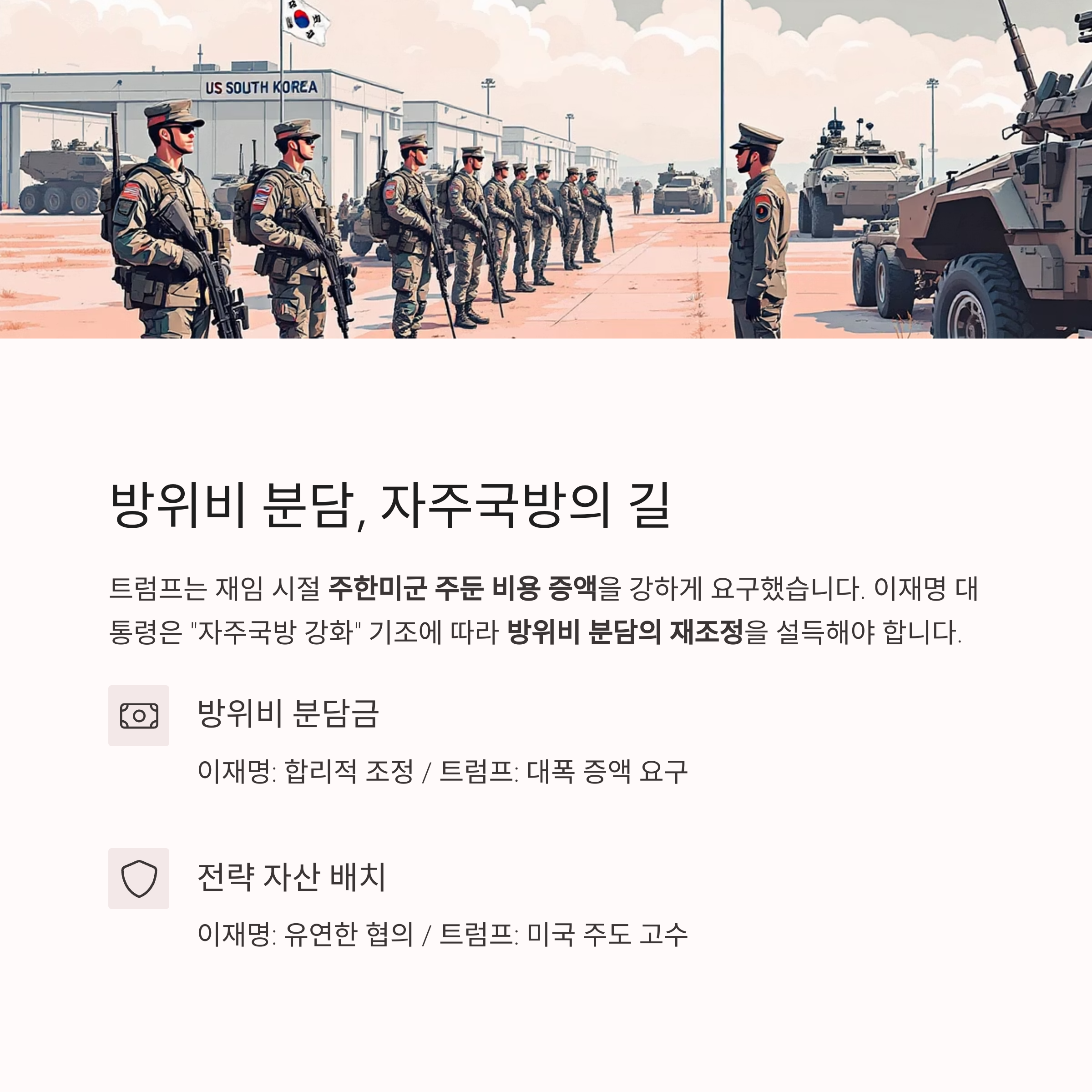 | 방위비 분담금 | 합리적 조정 강조 | 대폭 증액 요구 가능 |